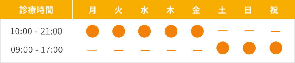 診療時間 | 月~金 9:00~20:00土曜 9:00~15:00 ※以下の時間帯は完全予約制で承ります 月~金20:00~22:00 土曜15:00~18:00 日・祝 9:00~15:00 |